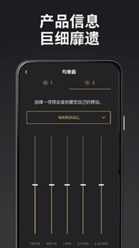 Marshall Bluetooth 应用程序是一款音乐播放器,可与 Marshall Acton II、Stanmore II 和 Woburn II 音箱配对。它提供定制均衡器、多房间设置和软件更新等功能,帮助用户优化音箱性能和欣赏高品质音乐。