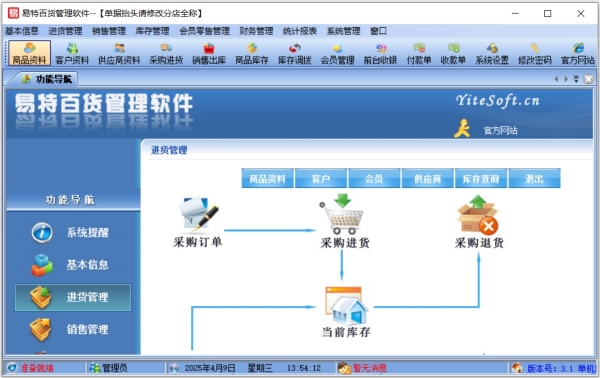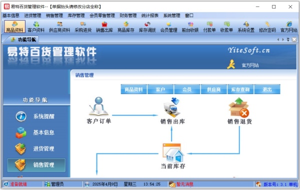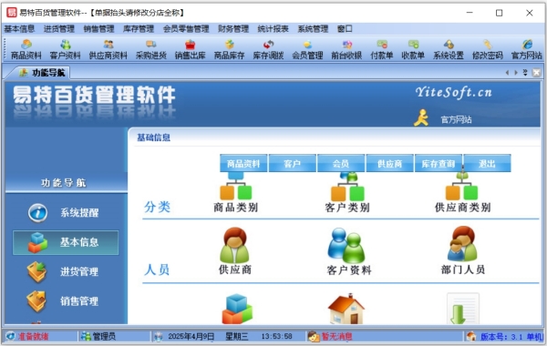 易特百货管理软件官方版是一款好用的百货商业管理工具,易特百货管理软件适用于商贸公司、个体门店等,可进行销售、库存、财务、客户及员工管理;易特百货管理软件最新版拥有强大报表与集成查询功能,让用户无需多窗口重复查询,涵盖商品销售、库存、财务报表等子模块,助力企业信息化管理。