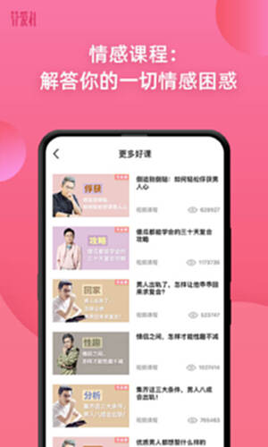 通过视频、直播、图文等多媒体形式,向用户传递脱单、恋爱、婚姻、出轨、分手等知识领域的情感技能,提升亲密关系心理学、认知科学知识储备,重塑正确理性的人际关系认知,完善自主解决情感问题能力,进而为自身建立系统而健康的恋爱观、婚姻观。