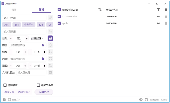 1、批量添加文件/文件夹:OncePower支持拖拽或通过菜单选择多个文件/文件夹进行批量处理,双击列表项自动填充原名至匹配框。