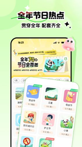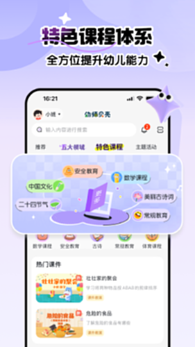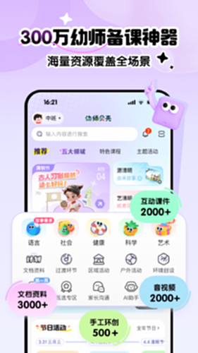 1、多元体系课程:根据小、中、大不同年龄段发展特点设计的高质互动课件1000+,涵盖幼儿园高频活动主题,同时提供安全教育、24节气、幼小衔接等特色体系课程,实时紧跟热点,持续更新内容,满足老师五大领域教学所需;