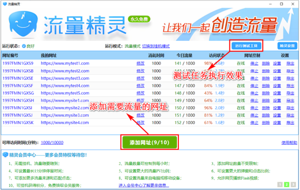 4、网址管理: 用户可添加需要流量的网址,系统分配唯一编号方便管理,并显示消耗时间、今日流量、访问状态等信息。