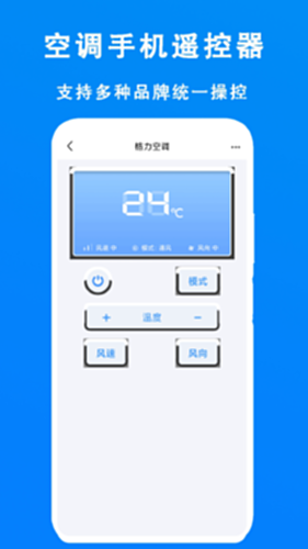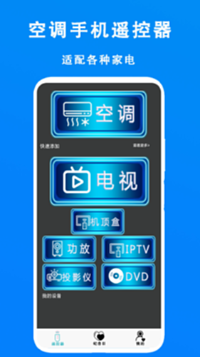 手机空调电视遥控器是一款一款功能丰富的遥控器软件 1、一款功能强大的手机智能遥控器,通过外接红外发射器可以直接控制空调、电视和支持红外的电风扇。界面简洁大方,功能强大,自有代码库,云端验证,让你的遥控器更智能。 2、支持电视、空调、红外电风扇一键匹配;支持自定义房间、设备名称,方便后期查询;支持上百种品牌电器型号; 若您的手机没有红外装置将无法使用