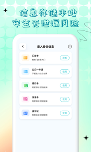 这款NFC门禁卡公交卡小工具界面简洁大方,操作简单易懂,卡包功能全面,一部手机就能放心出门游玩!NFC门禁卡公交卡这个工具助你更好的玩转NFC!