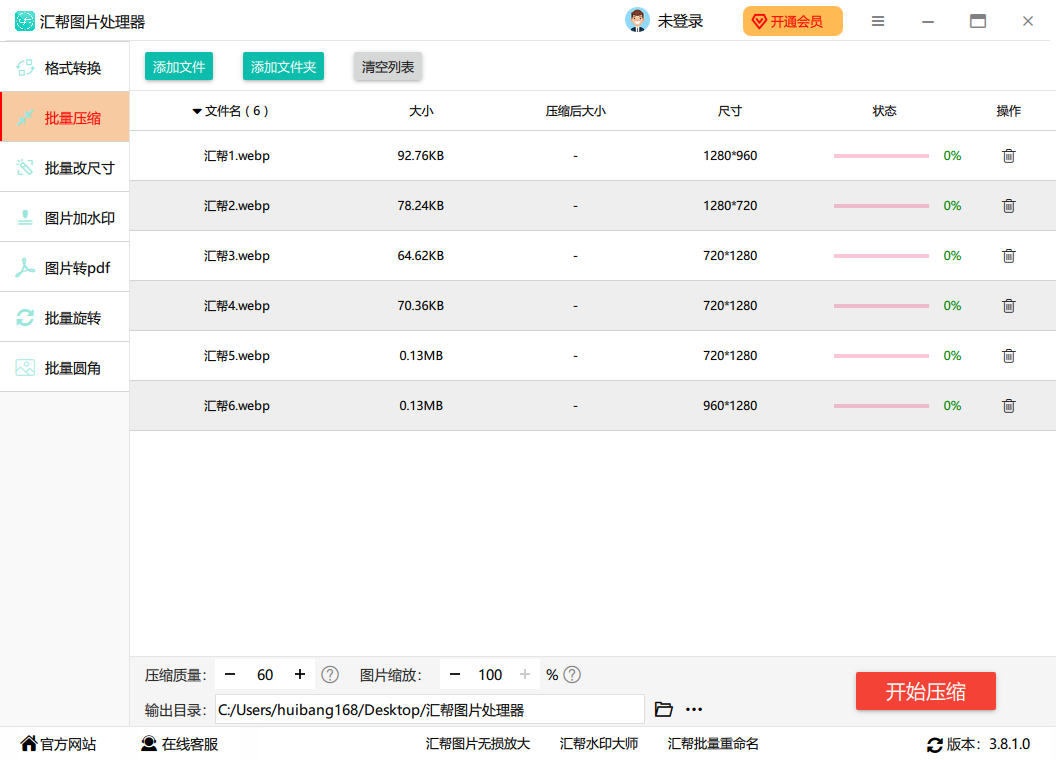 1、强大的图片压缩功能:汇帮图片处理器支持常见的JPG/PNG/BMP/WEBP/GIF等图片格式压缩。主要功能有:一键批量压缩、压缩成功率高、高效率压缩。