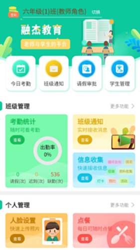融杰智慧校园方便家长学生教师的日常工作,功能有签到,请假审核,校园公告,班级通知,家庭作业,信息收集,成绩分析等功能。