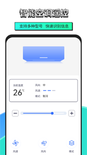 我们使用了模拟真机的遥控界面,不再单一的只能开启和关闭,还可以帮您操作其他遥控,比如换台、调声音大小、调温度、调风向、调功能、预约等等各种即可遥控!