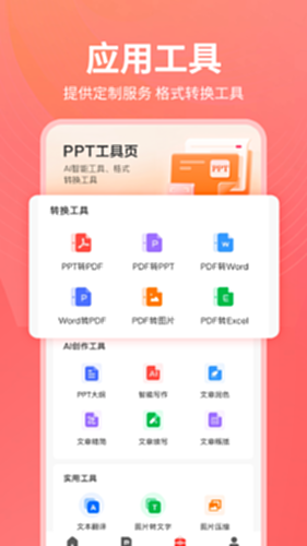 支持包括PDF转EXCEL,PDF转PPT,PDF转WORD,图片转PDF,PDF转图片,PPT转PDF,AI写文案多种工具使用,满足您格式转换的需求。