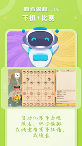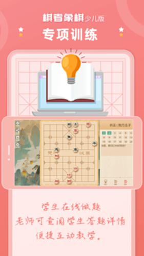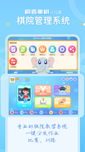 棋者象棋少儿版电脑版介绍:棋者象棋少儿版APP是一款集教务管理、线上学习于一体的棋类教育软件。它为学生提供专业的班级系统、比赛和训练作业平台,并通过数字化教务系统实现家校互动,让老师能够实时点评学生棋局,提高教学效率。此外,APP还提供在线积分编排赛、棋力评测和棋谱报告,帮助学生了解自己的棋力水平。丰富的习题类型和科学分类,满足不同阶段学生的学习需求,让象棋学习更有效率。