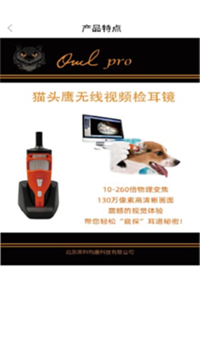 猫头鹰检耳镜是一款非常方便的可视化软件,能够帮助你连接北京荣科利康科技有限 公司出品的可视化设备,可对宠物外耳进行检查,在App显示清理耳道的实时画面,可 使影像放大便于观察