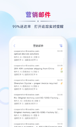 邮件数据多端实时同步更新,新邮件提醒,及时回复客户邮件,锁定每一个商机;联系人卡片,帮助快速识别客户类型,聚合往来邮件,转化邮件线索。