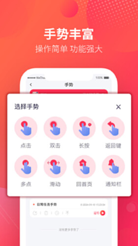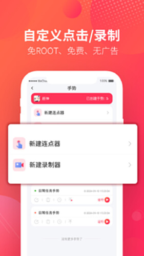 手势录制,功能多样化;有效的制作各种手游和应用辅助脚本,支持屏幕单点点击、多点循环点击、点击加滑动组合等多种手势。让你轻松搬砖、一键挂机!