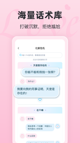 恋话宝电脑版是一款专为恋爱新手和遇到聊天困境者打造的应用程序。它提供超过100万条恋爱话术、5000多套教程、土味情话和表情包,旨在帮助用户破冰、推进关系,并解决聊天中的尬聊难题,从而提高情商和恋爱技巧,助力寻找和维系心仪对象。