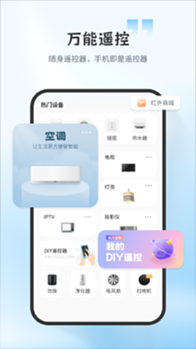万能遥控——本款遥控器支持13种家电的遥控,比如:空调、电视、机顶盒、投影仪、DVD等热门家庭设备都支持,每款设备下,包含众多品牌分类,根据操作提示,对准家电进行适配,家电开启之后,即可进行遥控哦!还可以保存您的已适配设备到创建的房间中,根据不同的房间进行分类,让您用的更明白、更简单,还支持本地天气预报的设置,显示天气情况、温度、湿度、空气质量,是您居家必备的遥控好帮手!若您的设备不具备红外功能,则需要购买红外设备才可以进行正常遥控哦!