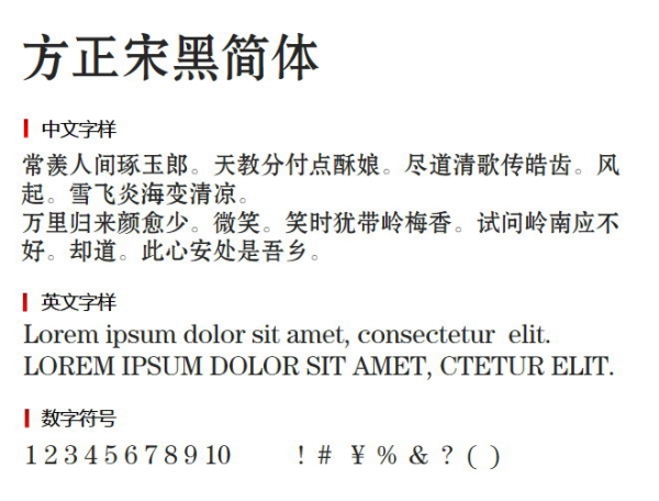 方正宋黑简体是一款设计简洁的中文简体字体;方正宋黑简体相较于传统宋体更为粗犷,方正宋黑简体适用于广告、名片、包装印刷等领域,为视觉作品增添艺术感和易读性,满足传统与现代设计需求,提升作品品质和吸引力;方正宋黑简体字体以古朴典雅的风格著称,字形方正大气,结构合理且粗细均匀,整体视觉效果出众。