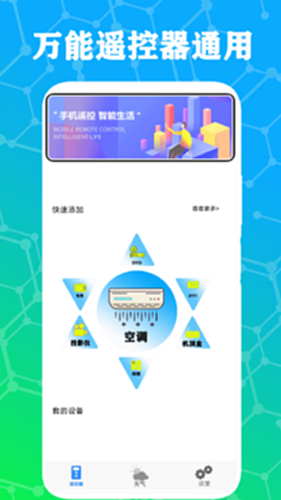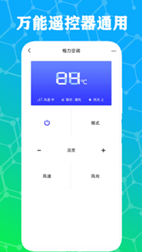 万能空调遥控器支持各种品牌空调,无需红外功能也可使用,内置遥控器码库,无需网络轻松遥控,人性化智能搜索遥控器,支持快速添加、编辑、删除、切换、排序,输入电器品牌/型号等关键词即可搜索,再不用对着数十套遥控器数据逐一匹配,没有红外功能的手机也可使用,WIFI遥控无需对准,接上外置红外发射器配件让手机遥控更轻松!