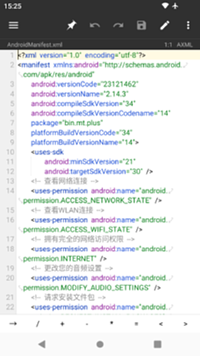 - 自带强大的文本编辑器,可以流畅编辑大文本文件,支持设置是否显示行号、开关自动换行、双指缩放字体大小、自动识别编码、代码语法高亮、自动缩进、正则搜索替换。