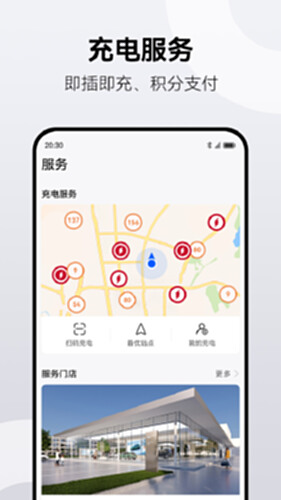 支持查看附近充电站点详情,直达最优充电站点,支持即插即充、免密支付或积分支付充电,支持家充桩授权使用;