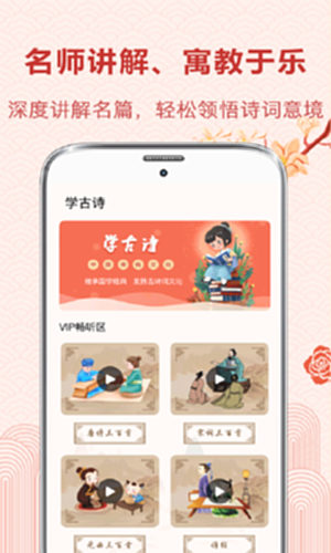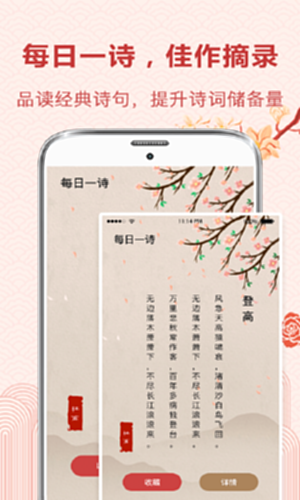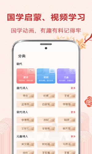唐诗宋词:这是一款学习唐诗三百首、宋词三百首、元曲三百首、小学诗词、初中诗词、高中诗词的古诗词软件,不但适合中小学生学习古诗词使用:每日背诵一首古诗词,查询各类古诗词诗句,还可以根据诗人进行分类查找;同时还提供适合儿童早教启蒙的三字经、论语、史记等内容、,让孩子从小接受传统文化的熏陶,传承中华民族传统文化。