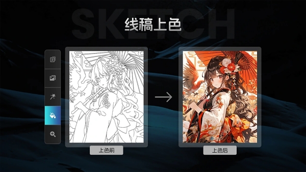 4、AI辅助绘画:提供线稿上色和扩图功能,自动上色并智能扩展画布,保持细节清晰。