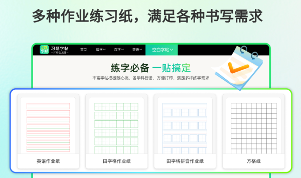 2、一站式学习工具:习题字帖打印生成器集习题、字帖、空白纸生成与打印于一体,无需切换多个软件。