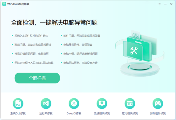 1、一键智能修复:智能分析并扫描电脑问题,一键修复因系统文件、DLL、DirectX缺失导致的崩溃、卡顿等故障,操作简单无需用户干预。