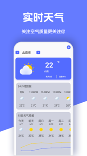实时天气象预报是一款查看各地城市的当地天气的app,新的一年新气象,关注天气变化,适宜增加衣物,祝您身体健康