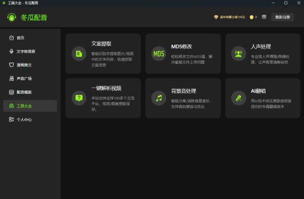 5、一站式创作平台:冬瓜配音集配音、视频、文案提取、音频处理于一体,是功能强大的AI内容创作工具。