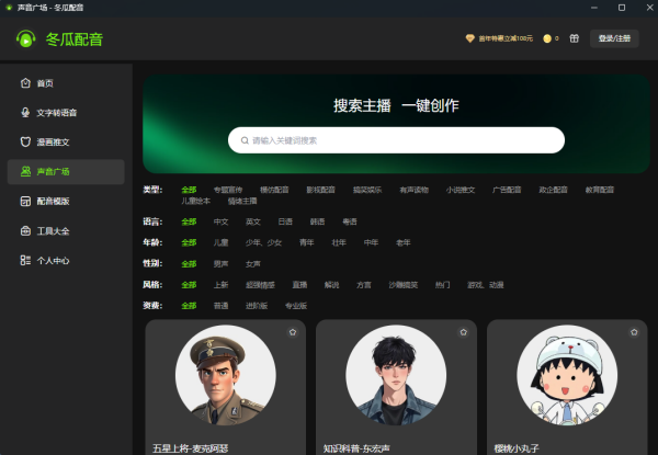 2、海量声音资源库:冬瓜配音内置500+种声音风格,覆盖12国语言与8种方言,满足多领域配音需求。