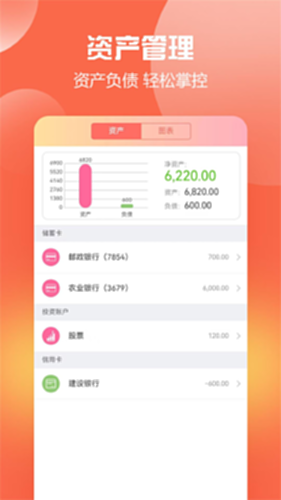◆资产账户:银行卡、微信钱包、支付宝、信用卡等资产账户,负债、余额一目了然。