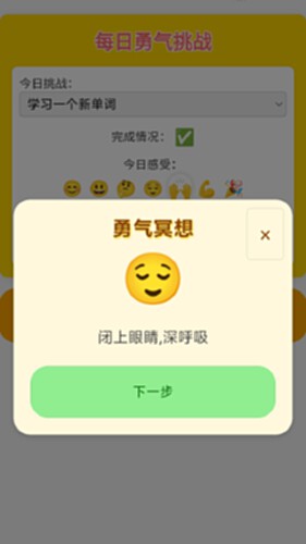 勇往向前电脑版介绍:“勇往向前电脑版”是一款正能量自我激励应用,通过每日勇气挑战、励志名言分享和冥想引导等功能,帮助用户建立积极生活态度。应用以温暖的黄色主题和友好的表情符号互动为特色,营造轻松愉悦的使用体验,支持用户在学习新知或培养习惯过程中获得成就感与信心,成为坚持前行的得力助手。