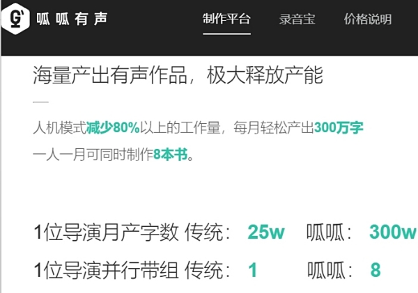3、人机协同,产能倍增:呱呱有声录音宝整合了AI技术与人工操作,形成全流程一体化解决方案,有效精简了制作工序,从而全面激活团队创作产能。