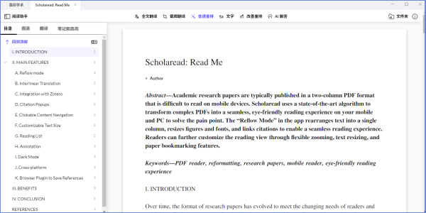 1、革命性论文重排模式:Scholaread靠岸学术采用先进算法将复杂的双栏PDF转换为适合移动端的流式排版,实现小屏幕无障碍阅读。