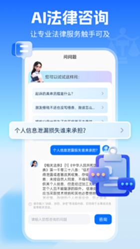 【智能法律咨询】:采用先进的人工智能AI技术,提供24小时在线的法律咨询服务;通过文字形式提交法律问题,AI助手即刻迅速给出专业解答;