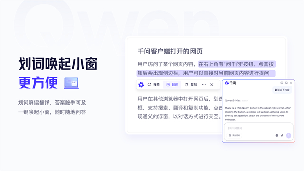 3、便捷划词功能: 选中任意文本即可快速唤起小窗进行解读或翻译,实现即时问答,操作无缝衔接。