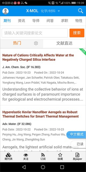 1、跨语言智能检索:X-MOL学术平台支持中英文文献同步查询,英文文献可一键切换中文模式,有效降低语言阅读门槛。