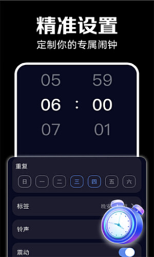 1、准时闹钟,能设置固定时间重复、选择自己喜欢的铃声及震动模式。