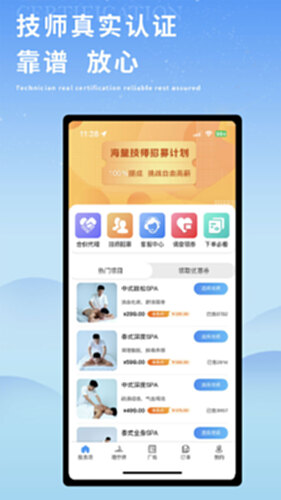 安心可靠:所有上门服务技师已通过实名认证、证书认证、健康认证等,经过专业老师的实操和理论培训。均有多年按摩养生行业服务经验。