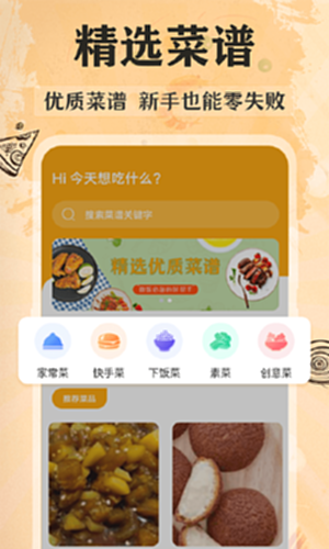 家常美食菜谱提供家常菜、快手菜、下饭菜、素菜、创意菜几大分类菜谱,收集很多甜品、烘焙、减肥、塑形等食谱,以及来自全国各地的数十万道中华美食,汇集各种中国美食、健康食谱、家常菜、健身食谱、美食制作等食谱美食轻松制作。也有对您的健康状态,体质,慢性疾病和食疗的照顾性菜谱。让你体验享受各种制作美食的乐趣!用了家常菜谱大全,小白也能DIY学会做饭,让做菜变得简单又容易,家常菜谱大全汇聚了各类美容、育儿、孕产、养生、煲汤、厨房宝典的美食视频,为您一一详解中华料理美味的厨中秘诀,令您尽享居家烹饪之乐。想做什么材料的菜,打开搜索,您都能马上找到相关的美味菜谱。