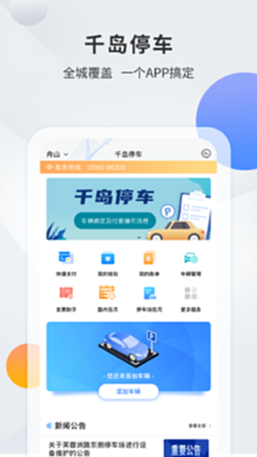 千岛停车APP是一款为舟山机动车车主量身定做的智慧停车APP,为全体车主提供统一入口的智能停车服务,包括停车导航、车辆缴费、自动支付无感离场等服务,实现全市范围内通停通付。