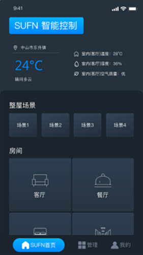 Sufn Smart是由中山市岩峰照明科技有限公司开发的物联网应用,能够对智能灯光的电源、亮度、色温、色彩等进行控制。同时还支持对窗帘、开关、空调等物联网设备进行控制