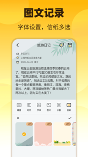 「文字排版」 对齐模式、字体样式、字体大小、字体颜色、粗体调整一应俱全,排版出你的日记样式