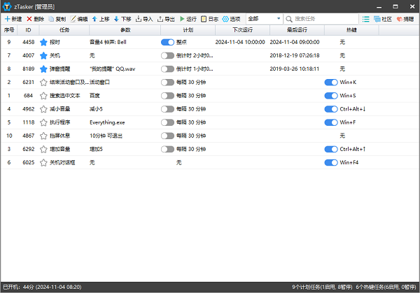 zTasker(自动化定时任务工具)是一款强大的自动化任务管理工具,支持超过50种任务类型,涵盖文件操作、系统命令、软件控制等。zTasker提供了多达16种灵活的定时与条件触发方式,无论是按固定时间周期执行,还是根据电脑电量、程序启动等特定系统状态响应,都能精准设置。zTasker便捷高效,能高度的自定义,极大地优化时间与精力,提升个人与工作效率。