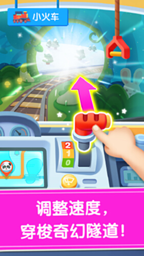 拉闸、鸣笛,“呜”——小火车发车啦!宝宝把档位调至二挡,沿着轨道加速前进。瞧,小火车经过了皑皑雪山,广袤草原,又驶向浩瀚沙漠……“前方到站,沙漠滑坡”!