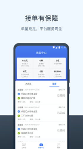 页面简洁,使用一键上手;多个渠道,多点收入;安全合规,全天派单,订单可选。