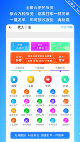把需求描述发出,等着接单人主动联系上门,10000多个专业,每天新增200多个专业,不用搜不用找,智能派单给相关专业的接单人,找人干活、干杂活、小时工、找师傅、需要什么 发出去,等着就能解决问题