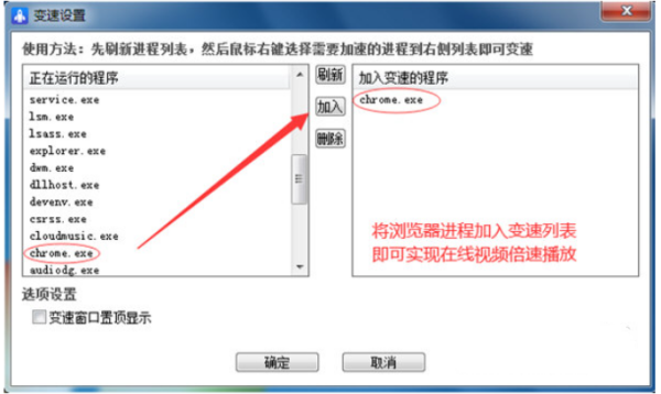 1、进程变速管理:通过添加浏览器、播放器或游戏进程至列表,实现对视频、音频及游戏运行速度的自由调节。