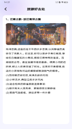 无论是繁华都市,还是小众旅游地,我们的系统都能精准识别,点击日期选定您的出行日期。如果您计划的是一场单程旅行,选择出发日期后,点击查询按钮,应用便会飞速筛选出该日从出发地飞往目的地的所有航班信息,包括不同航空公司的航班、起飞与降落时间等。若您的行程是往返的,在选择出发日期后,继续选定返程日期,应用同样会为您全面呈现符合条件的往返航班组合,让您掌握完整行程的机票详情。此外还包含一些旅游景点的介绍可供用户出行参考查阅。出行清单内置涵盖证件、衣物、必备用品等物品的默认清单,还支持自由删减与个性化补充,让行李整理不再繁琐。从机票查询到行李准备,助力轻松出发,开启完美旅程