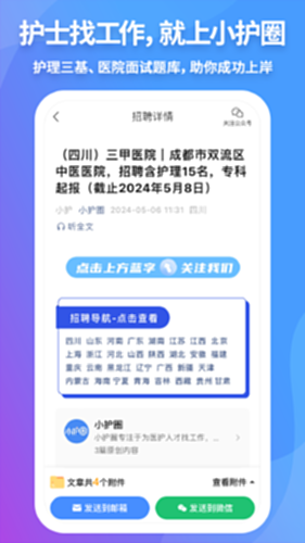 护圈专注于为医护人才找工作,为您提供全国主要城市公立、民营医院招聘信息,卫生事业编制,提供全国护士招聘、规培信息,每天更新医院招聘信息,医生、护士找工作就上小护圈,更省力!专业的医护找工作软件。为中专,大专,本科,研究生等学历护士人才提供高效快捷的医院求职招聘服务。