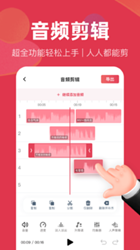 1.音乐剪辑:支持音频拼接、混音、裁剪、分割等多种个性化剪辑需求,同时支持调节淡入淡出、升降调、变速、音量调节、均衡器等音频效果